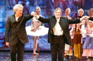 летмейстер Владимир Васильев и дирижер Андрей Аниханов (справа налево) после премьеры балета «Лебединое озеро» в постановке балетмейстера Владимира Васильева в Татарском театре оперы и балета имени Мусы Джалиля.