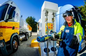 На фото: водитель Гуннар Луккас заправляет свой автомобиль на первой общественной заправке под брендом СПГ в Германии. СПГ (сжиженный природный газ) становится все более интересным для операторов автопарков, поскольку он может привести к экономическим преимуществам по сравнению с дизельным топливом и потому, что он считается более экологически чистым.