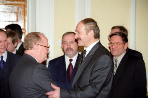 На фото: президент Белоруссии Александр Лукашенко (на первом плане справа) и председатель Центробанка РФ Виктор Геращенко во время встречи в Москве (на первом плане слева), 1998 год. Цитата от Виктора Геращенко: «Работать, работать и работать, как говорил кто-то. (В ответ на вопрос корреспондента: Что же делать?)».