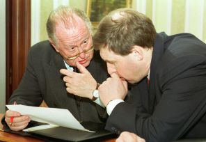 На фото: советник президента РФ Андрей Илларионов (справа) и глава Центробанка Виктор Геращенко (слева) перед началом совещания по экономическим вопросам, которое провел в Кремле президент РФ Владимир Путин, 2001 год. Цитата от Виктора Геращенко: «Нулевая инфляция бывает только на кладбище».