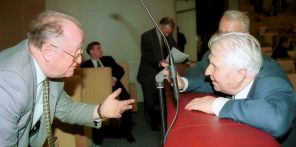 Вопрос об общем объеме «коммерческой» задолженности, который мог быть предъявлен России по основному долгу и процентам рассматривался на «Правительственном часе» в Госдуме РФ. Долг составлял 5,5 млрд долларов. Эта задолженность представляет собой долг перед десятками тысяч зарубежных компаний, которые поставляли в СССР в конце 80-х годов товары и свою продукцию. На фото: председатель Центробанка Виктор Геращенко (слева) и депутат от фракции КПРФ Егор Лигачев (справа) во время беседы, 2001 год.