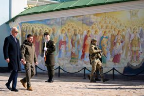 Ранее сегодня утром Байден присоединился к Зеленскому в возложении венка к Стене памяти в городе, где чествуют украинских солдат, погибших во время войны.