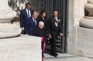 Траурная месса по римскому понтифику Франциску Бергольо была отслужена в соборе Святого Петра, как это предусмотрено в Ordo Exsequiarum Romani Pontificis. На фото: президент США Дональд Трамп и первая леди Мелания.