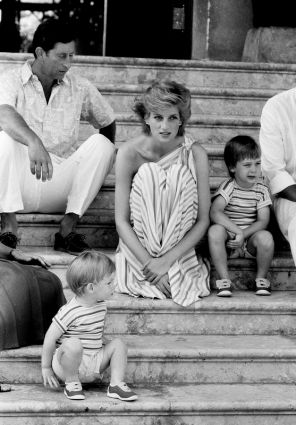 На фото: принц Чарльз, принц Уэльский, со своей женой Дианой, принцессой Уэльской, и их сыновьями принцем Гарри, слева внизу, и принцем Уильямом, сидят на ступенях во время фотосессии в Marivent Palace, в Пальма-де-Майорке, Испания, 1986 год.