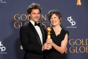 На фото: Клеман Дюколь ​​(слева) и Камилла позируют в пресс-зале с наградой за лучшую оригинальную песню — фильм «Эль Мал» из фильма «Эмилия Перес».