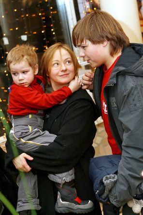 На фото: актриса Евгения Добровольская с сыновьями Яном (слева) и Николаем (справа) на премьере анимационной комедии «Правдивая история Красной Шапки» в кинотеатре «Горизонт», 2006 год.