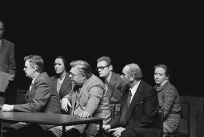 На фото: актеры Леонид Иванович Губанов в роли Рачадова, Михаил Николаевич Зимин в роли Казнакова, Юрий Леонидович Леонидов в роли Артюшкина (слева направо на первом плане), Любовь Васильевна Стриженова в роли Медведевой, Вячеслав Николаевич Расцветаев в роли Кухаренко и Ия Сергеевна Саввина в роли Вязниковой (слева направо на втором плане) в спектакле «Обратная связь» по одноименной пьесе Александра Исааковича Гельмана в постановке Олега Николаевича Ефремова на сцене Московского Художественного академического театра СССР имени М. Горького, 1977 год.