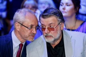 На фото: председатель комиссии по культуре и массовым коммуникациям Московской городской думы Евгений Герасимов и художественный руководитель «Московского академического театра сатиры» Александр Ширвиндт (слева направо) на открытии V Московского кинофестиваля «Будем Жить», приуроченного ко Дню российского кино, в кинотеатре-шатре на Воробьевых горах, 2016 год.