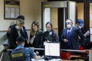 На фото: музыкант Гарик Сукачев, жена актера Михаила Ефремова Софья Кругликова (справа налево) в Пресненском суде перед началом оглашения приговора Михаилу Ефремову по делу о ДТП со смертельным исходом, 2020 год.