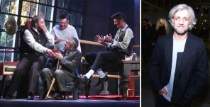 На фото: актеры Владислав Ветров (Сем), Михаил Ефремов (Макс), Дмитрий Смолев (Джой) и Александр Хованский (Тедди) (слева направо) в сцене спектакля «Не становись чужим» в постановке режиссера Сергея Газарова и Евгения Митта (снимок справа) в театре «Современник», 2019 год.