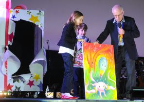 На фото: режиссер Александр Митта с внуками во время творческого вечера, посвященного его 80-летнему юбилею, в Доме кино, 2013 год.
