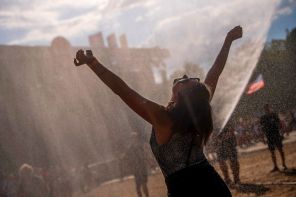 На фото: посетительница Фестиваля охлаждается с помощью генератора пара.