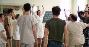 «У кого из вас, сумасшедших, есть хоть капля смелости?» — спрашивает Макмерфи, буйный новый пациент больницы, тем самым настраивая себя и свою паству на столкновение с властями в целом и с Рэтчед в частности. Комедия взрывается, как фейерверк. Драматичные сцены обрушиваются с силой молота. Макмёрфи ненавидит бюрократию, обрушивается на регламент и снабжает пациентов дозой неприкрытого мачизма. Мужчины — «кастрированные развалины», которым нужно заново обрести свою силу. Женщины — либо хихикающие секс-работницы, либо «кастраты-наседки». Но фильм не лишён нюансов и ощущения напряжённой сложности жизни. Важно отметить, что игра Луизы Флетчер в роли Рэтчед гарантирует, что монстр Кизи остаётся человеком. Она — измученный профессионал и такой же представитель своего времени, как и Макмерфи. Рэтчед в меньшинстве, и отделение находится в осаде. Неудивительно, что в конечном счёте она прибегает к помощи джамп-лидеров.