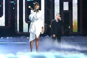 На фото: певцы NЮ (Юрий Николаенко) и Асия (Анастасия Алентьева) во время юбилейной 30-й церемонии вручения Национальной музыкальной премии «Золотой Граммофон» в ВТБ Арене.