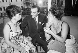 Еще одним известным гостем стал итальянский режиссер Лукино Висконти, который вошел в состав жюри фестиваля. На фото: итальянская киноактриса Джина Лоллобриджида, член жюри II ММКФ, итальянский кинорежиссер Лукино Висконти и итальянская киноактриса Мариза Мерлини (слева направо) в фойе фестивального кинотеатра «Россия» во время II Московского международного кинофестиваля, 1961 год.