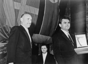 В фестивале приняли участие делегации из 25 стран мира, а председателем жюри стал режиссер Сергей Герасимов. На фото: кинорежиссер Сергей Герасимов (слева) во время вручения Большого золотого приза Сергею Бондарчуку за фильм «Судьба человека», Первый Международный кинофестиваль в Москве, 1959 год.