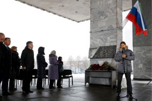 На фото: заместитель генерального директора «Первого канала» Кирилл Клейменов (справа) и президент Открытого акционерного общества «Творческое объединение «Красная звезда», журналист Алексей Пиманов (третий слева) у телецентра «Останкино» на открытии мемориала в память о погибших журналистах 25 декабря 2016 года при крушении самолета ТУ-154 Минобороны РФ. Москва, 2017 год.