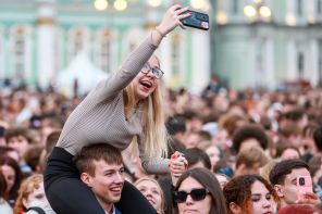 На концерте на Дворцовой площади под хиты молодости своих родителей нарядные парни и девушки танцевали, слэмились и обливались водой.