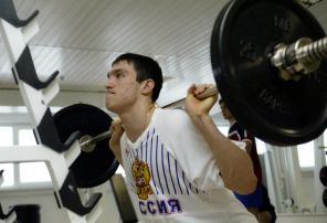 На фото: Александр Овечкин во время занятий со штангой. Хоккей, Сборная России, Тренировка на тренажерах в Одинцово, 2004 год.