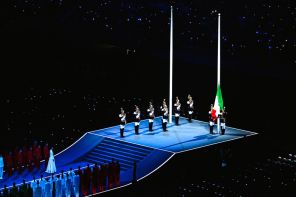 На фото: поднятие государственного флага Италии во время церемонии открытия на олимпийском стадионе «Сан-Сиро».