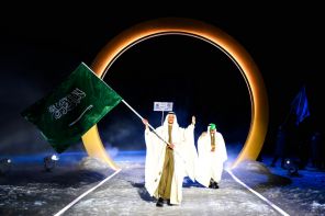 На фото: спортсмены Саудовской Аравии и знаменосец Ракан Алиреза во время церемонии открытия зимних Олимпийских игр 2026 года 6 февраля 2026 года в Предаццо.
