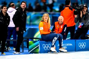 На фото: Ютта Леердам из Нидерландов рядом со своим тренером после соревнований по конькобежному спорту на дистанции 500 метров среди женщин в 9-й день зимних Олимпийских игр.