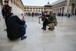 На фото: мальчик позирует для фото с бойцом оппозиционной группировки в маске, держащим пистолет во дворе мечети Омейядов в старом городе-крепости Дамаск, Сирия.