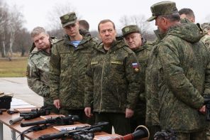 На фото: заместитель председателя Совета безопасности РФ, председатель партии «Единая Россия» РФ Дмитрий Медведев во время посещения военного полигона Алабино в Московской области.