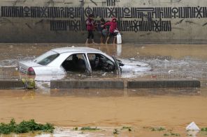 На фото: наводнение в Бейруте. Уличные торговцы проходят перед автомобилем, затопленным паводковой водой, на шоссе, затопленном дождями, в Бейруте, Ливан, суббота, 23 декабря 2023 года