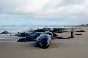 На фото, предоставленном Департаментом природных ресурсов и окружающей среды Тасмании: выбросившиеся на берег косатки. Более 150 малых косаток были обнаружены на отдаленном пляже у реки Артур на западном побережье острова. К утру в живых осталось 90 животных и, после неудачных из-за сильного ветра и шторма попыток вернуть их в море, было принято решение усыпить китов, чтобы свести их страдания к минимуму.