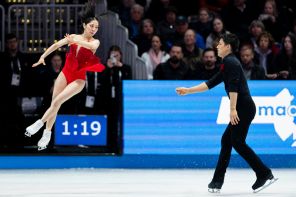 На фото: Миура Рику (слева)/Кихара Рюичи из Японии выступают в произвольной программе парного катания на чемпионате мира по фигурному катанию ISU 2025 в Бостоне, США.