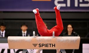 На фото: падение Нильса Дункеля во время выступления на Кубке DTB по спортивной гимнастике 2025 в Штутгарте, Германия.