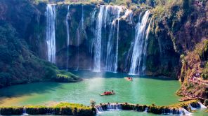 На фото: туристы в живописном районе водопадов Цзюлун в уезде Лопин, провинция Юньнань на юго-западе Китая.