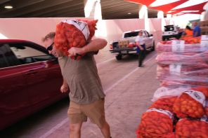 На фото: волонтер Джоэл Эрнандес помогает загрузить картофель в автомобиль во время раздачи продуктов питания семьям федеральных служащих, пострадавшим от приостановки работы федеральных органов власти, а также получателям SNAP в Сан-Антонио.