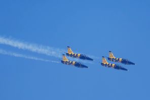 На фото: латвийская пилотажная группа «Балтийские пчелы» (Baltic Bees) во время авиашоу на международной аэрокосмической выставке Dubai Airshow 2025.
