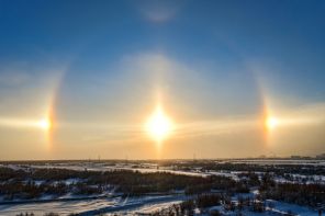 На фото: гало над Якутском, Республика Саха (Якутия), Россия. Солнечное гало — необычное оптическое явление в виде дуги вокруг солнца, чаще всего наблюдается в морозную погоду в условиях повышенной влажности, в воздухе при этом находится большое количество ледяных кристаллов.