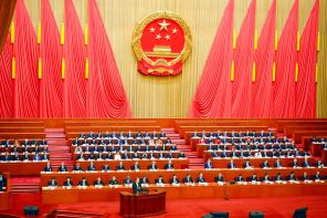 На фото: председатель Постоянного комитета Всекитайского собрания народных представителей (ПК ВСНП) Чжао Лэцзи (в центре) на пленарном заседании Всекитайского собрания народных представителей, Пекин, Китай.