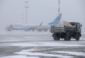 На фото: во время снегопада в аэропорту Внуково, Россия.