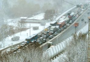 На фото: автомобильная пробка во время снегопада в Москве, Россия.